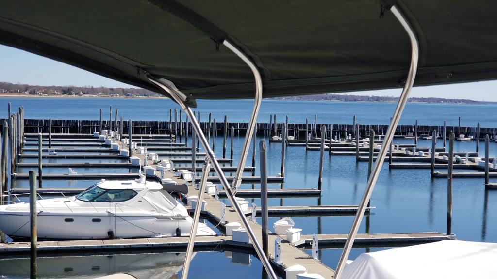 With the shinkwrap off and the bimini on, you can see what a lovely day it would be to be boating, if there were any boats…. The Tiara in the foreground had just been splashed and delivered to its slip. I’m guessing they have an interested buyer asking for a sea trial.